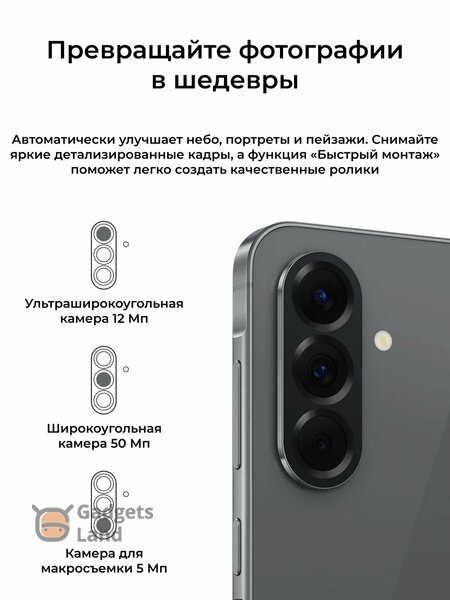 Экран: 6.7" (2340x1080) Super AMOLED; Встроенная память: 128 ГБ; Оперативная память: 8 ГБ; Тройная камера: 50 МП, 12Мп, 5 МП; Фронтальная камера 12Мп; Аккумулятор: 5000 мА·ч; SIM-карты: 2 (SIM); Операционная система: Android 15; Беспроводные интерфейсы: Bluetooth, NFC, Wi-Fi; Стандарт связи: 2G, 3G, 4G, 5G; Вес: 198 г